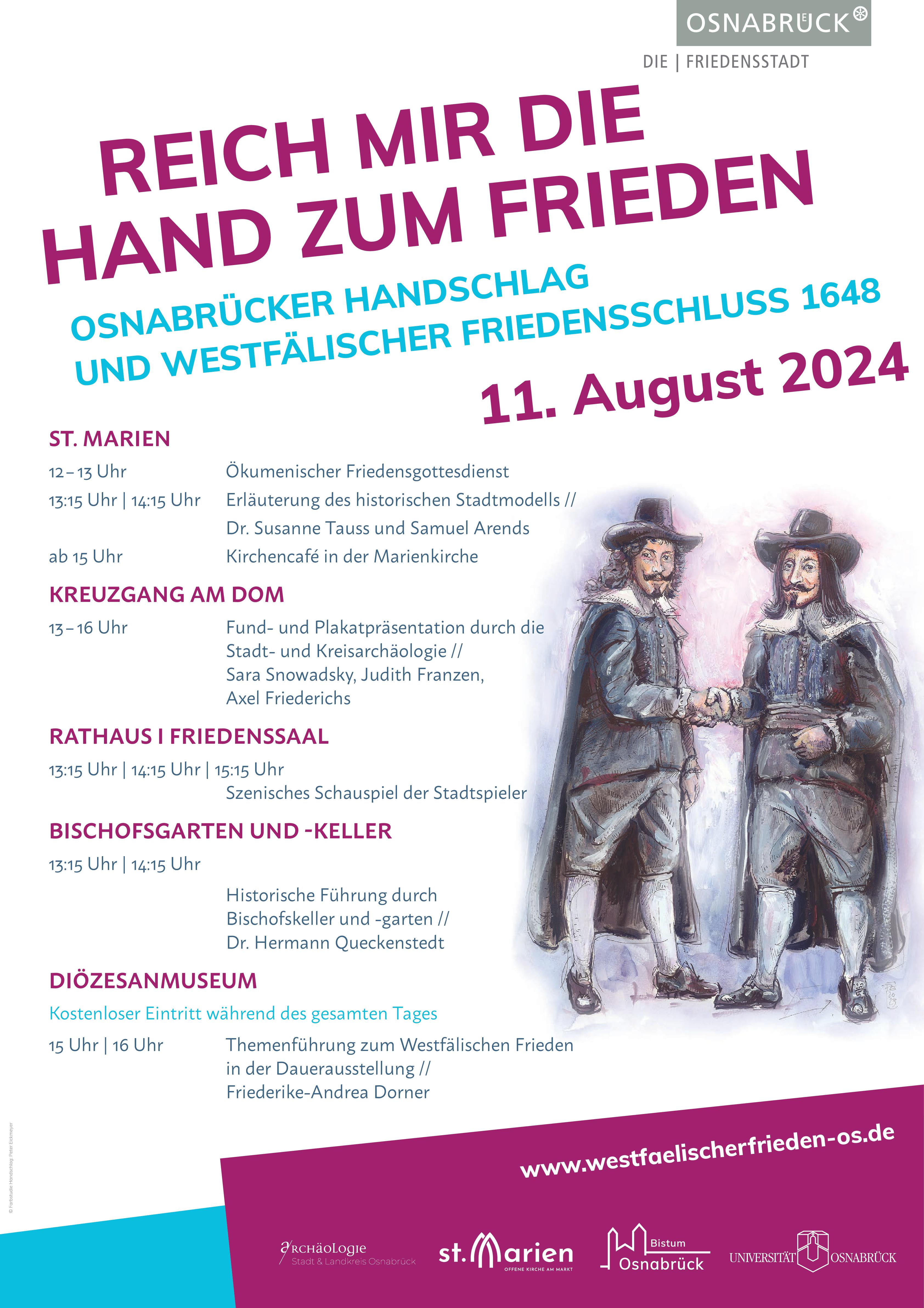 Anlässlich des Osnabrücker Handschlags, der dem Abschluss des Westfälischen Friedens vorausging und der sich in diesem Jahr zum 376. Mal jährt, erinnert das Forschungszentrum IKFN in Zusammenarbeit mit dem Diözesanmuseum im Rahmen des Veranstaltungstages „Reich mir die Hand zum Frieden“ am 11. August 2024 an ebendieses Ereignis.